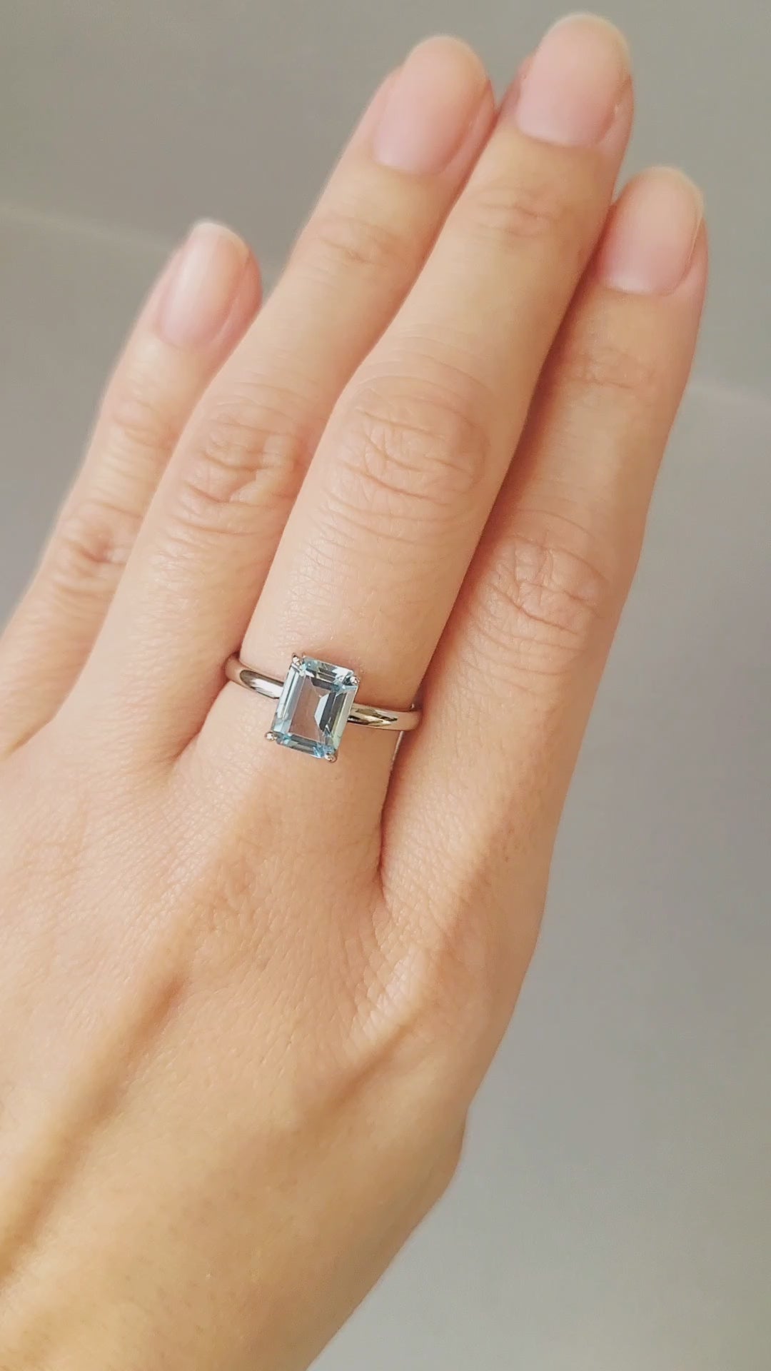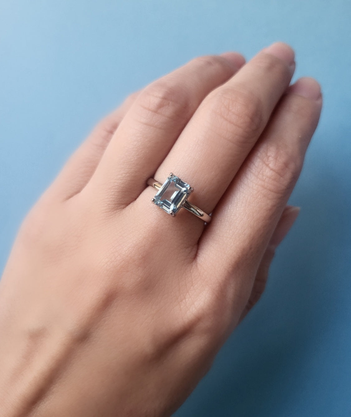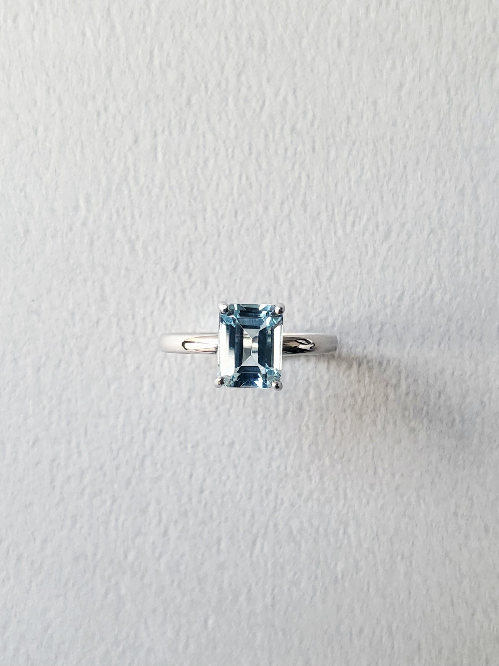 エメラルドカットのアクアマリンをのぞき込むと、その澄んだ色の美しさと透明度に目が奪われます。
